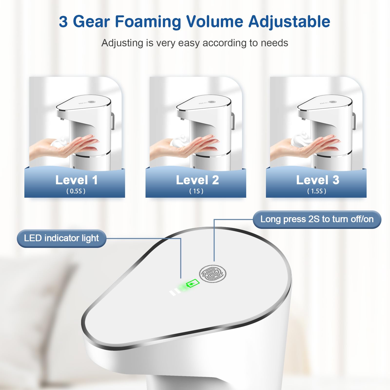 3 Level Soap Volume Adjustable Soap Dispenser and Low Noise: Our hand soap dispenser offers 3 levels of foam adjustment, allowing you to customize the amount of soap dispensed according to your preference. You can adjust the soap volume by short presss the power button. Great for preventing waste.In addition, the foam soap dispenser operates with low noise, providing a quiet and peaceful environment