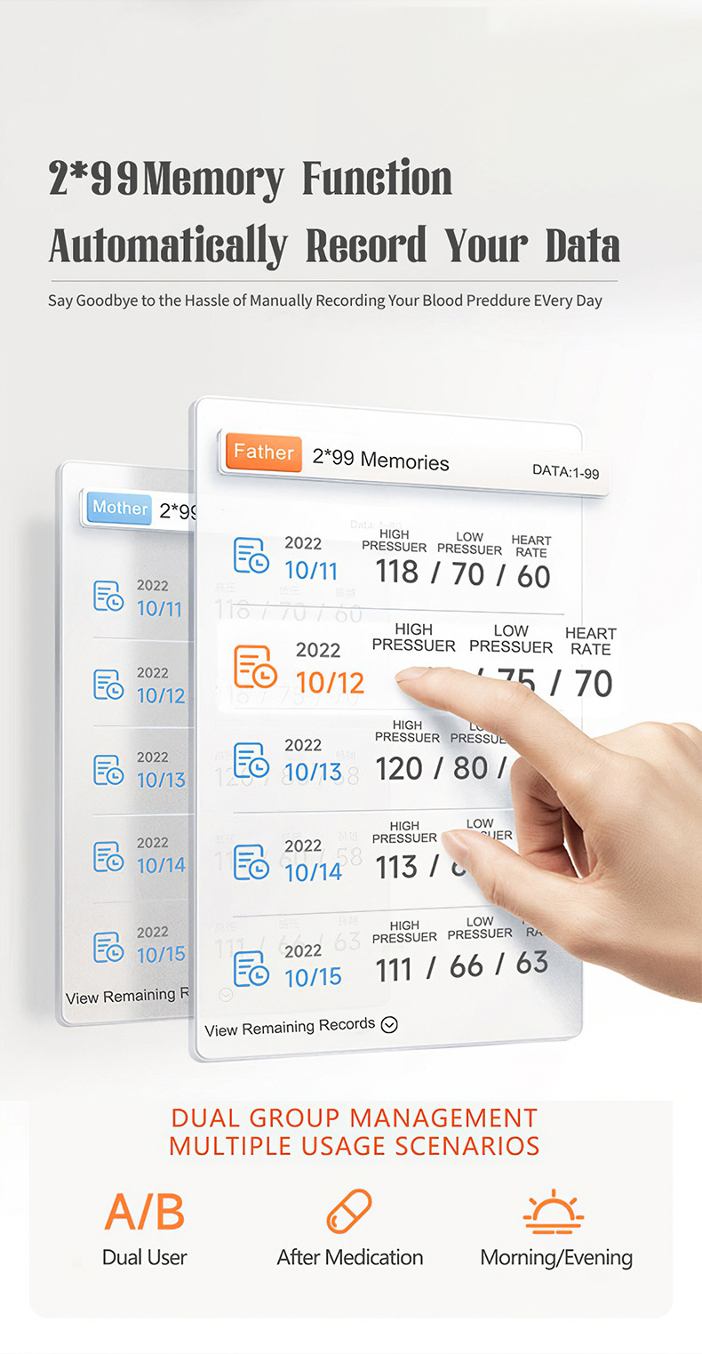 Memory Function: Store up to 198 readings (99 for 2 users) for convenient tracking and monitoring of your blood pressure over time.2*99 Records & Adjustable Blood Pressure Cuff. Our home-use blood pressure monitor is accessible for two accounts with each capable of storing up to 99 records, making it convenient for family members to fully record blood pressure.