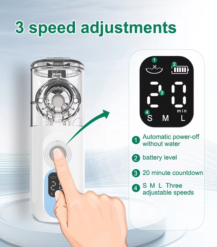 【Advanced Digital Display】- Equipped with an intelligent digital display that provides real-time updates on battery life, a 20-minute timer, and other essential data. This intuitive interface ensures you always stay informed about treatment duration and power levels, Our advanced mesh nebulizer offers precise control over each treatment session.